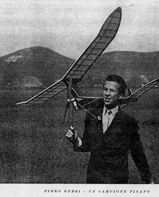 Piero Gnesi mostra il suo motomodello "Il Bucanuvole". Dalla copertina del n. 14 di "Notiziario Aeromodellistico".