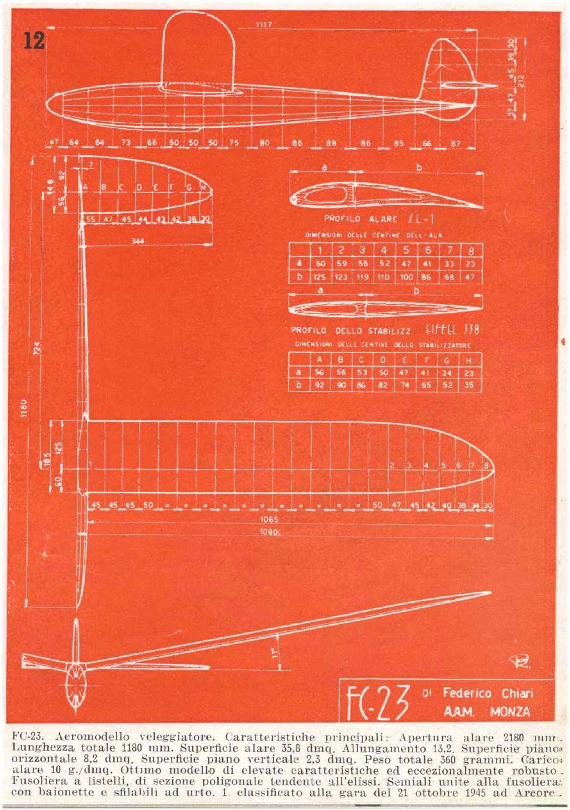 Il modello veleggiatore "FC-23" di Federico Chiari, A.A.M.-Monza. Da "Alata", 1946.