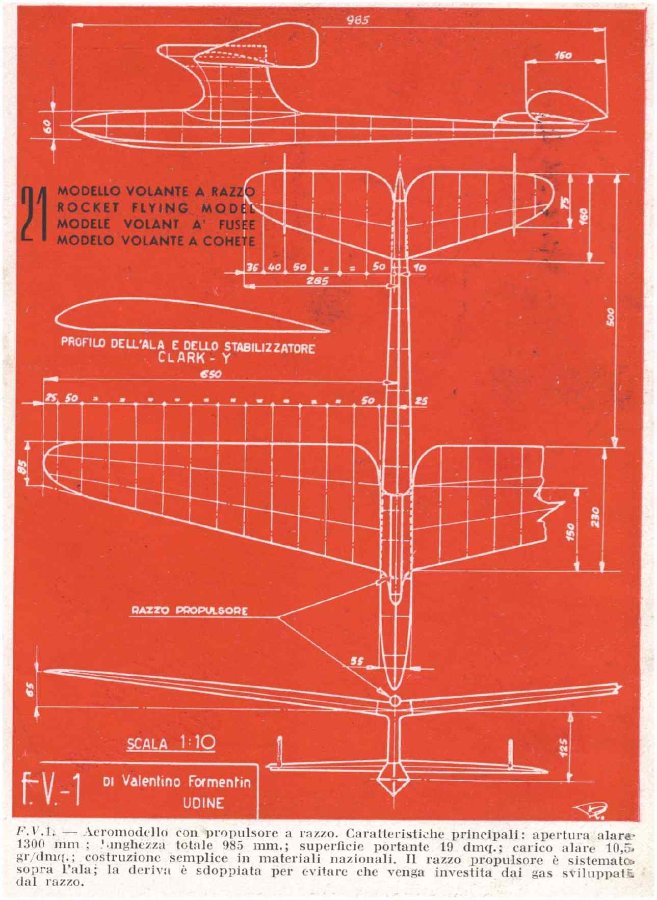 Il modello a motore a razzo "F.V.-1" di Valentino Formentin, Udine. Da "Alata", 1946.