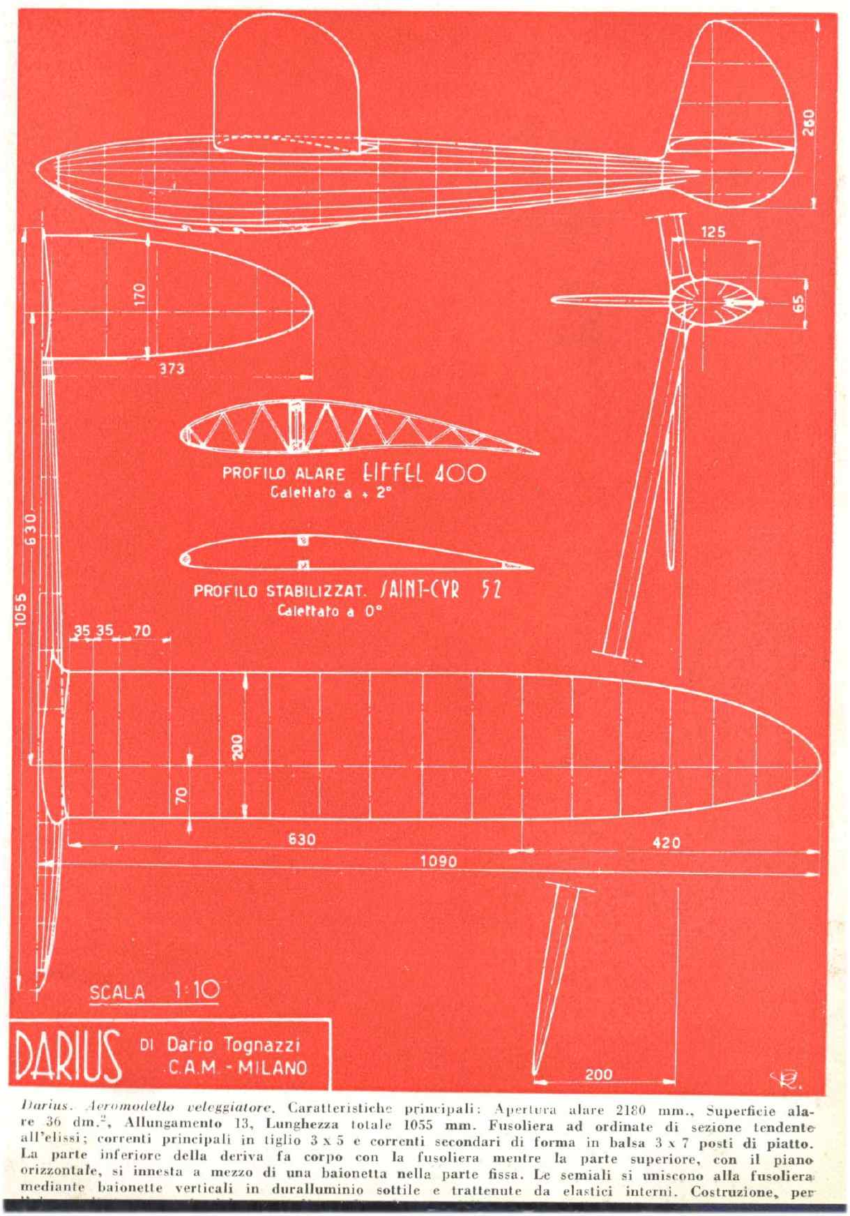 Il modello veleggiatore "Darius" di Dario Tognazzi. Da "Alata", 1945.