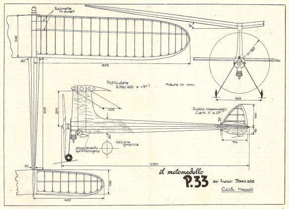 Motorizzato con il Kratmo 10 ecco il notevole motomodello "P.33"dei fratelli Pascale del CUS Napoli. Da L'Ala, n. 15/16, 1948.