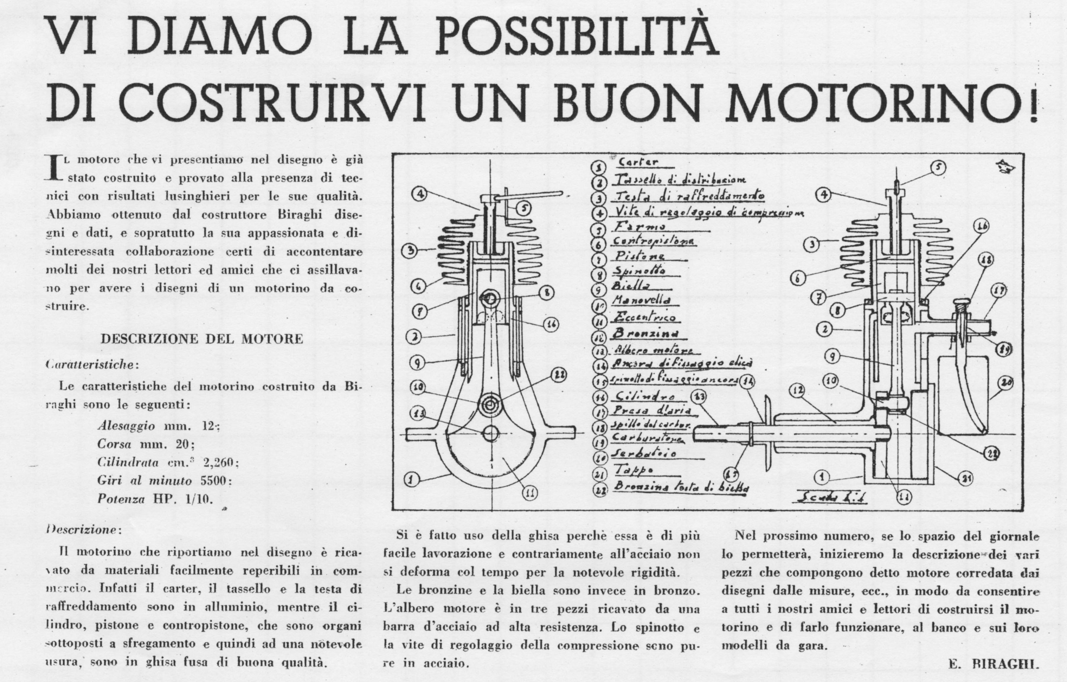 Emilio Biraghi presenta un suo motore per l'autocostruzione, dal numero 7 del 1944 de "L'Aquilone"