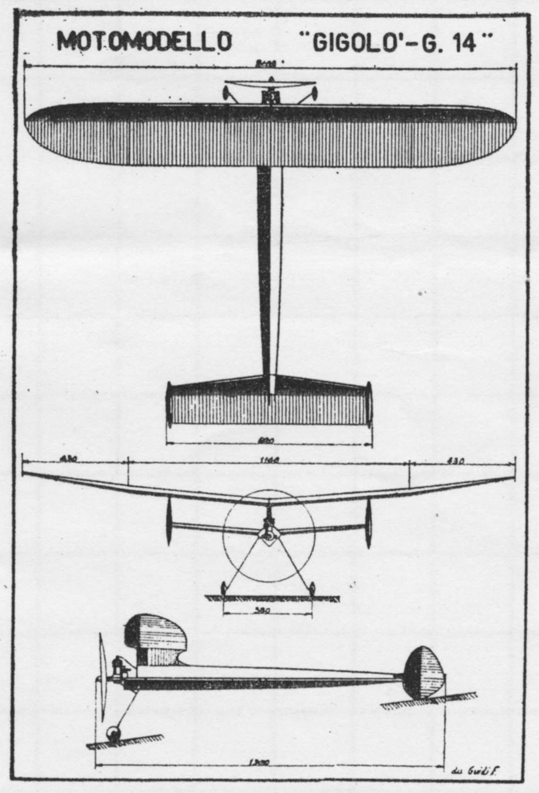 Il motomodello "Gigolò G-14" di Filippo Guidi, dal numero 1 del 1945 de "L'Aquilone"