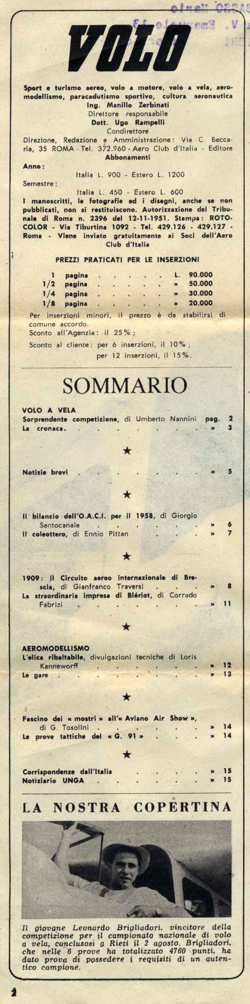 Periodico mensile fu edito a Roma dall' Aero Club d'Italia a partire, presumibilmente, dal 1951. Le pubblicazioni cessarono verso la fine del 1965 inizio 1966.     Fu principalmente dedicato allo sport e turismo aereo, al volo a motore, al volo a vela, al paracadutismo sportivo, alla cultura aeronautica ed anche, ovviamente, all'aeromodellismo.     Ebbe una veste editoriale alquanto dimessa in sintonia con il tempo in cui nacque ma un po' meno nel 1966. Non ebbe grande diffusione, probabilmente fu diffusa solamente per abbonamento ai soci dell'Aero Club.     Qui a sinistra indice e colophon del numero di agosto 1959.     Come si vede, i collaboratori aeromodellistici sono alcuni dei soliti noti di area romana: Elvio Tosaroni e Loris Kanneworff. Riportiamo di seguito i loro articoli.     Interessanti le notizie sulle gloriose coppe dell'epoca (Sperandini e Bonmartini) destinate alla reclamizzazione e diffusione dell'aeromodellismo.     Ineccepibile, come al solito, l'articolo tecnico di Loris Kanneworff; peccato che sia disponibile (per ora) solo la seconda puntata! |